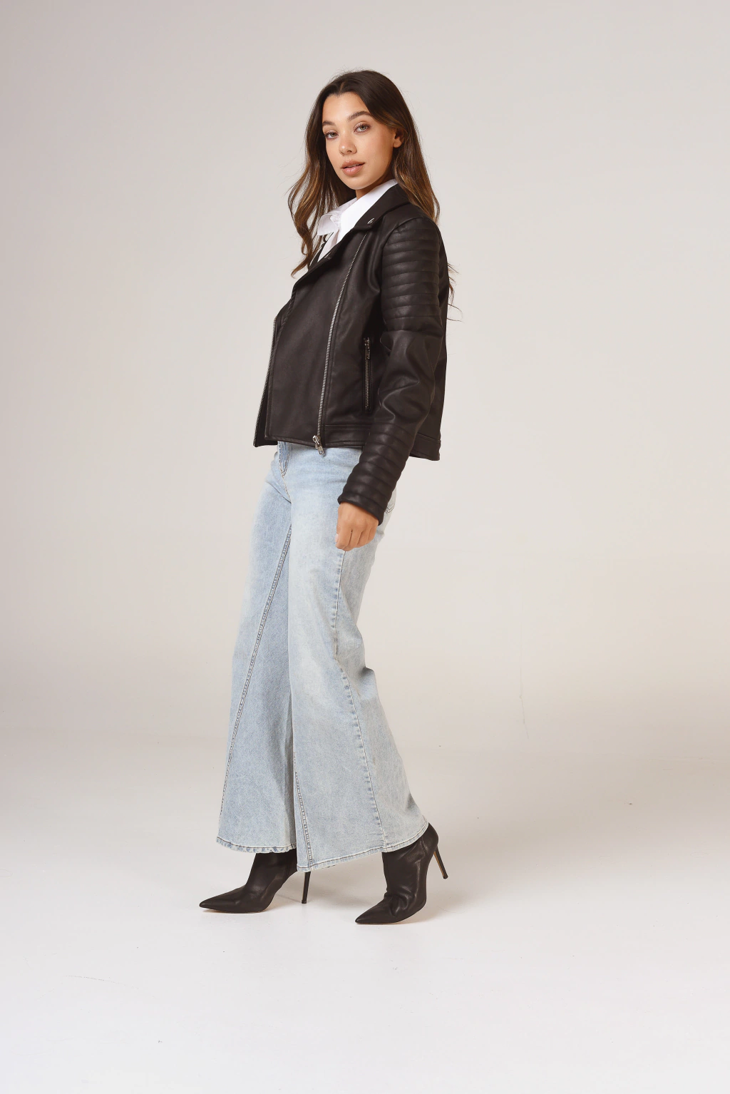 Motoquera de P.U calce clásico, broches en punta de cuello y solapas,