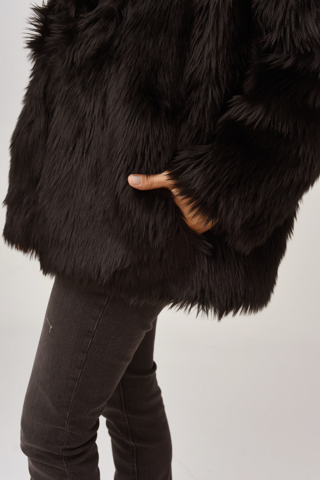 Tapado en piel sintetica Cream, hasta la cadera, cuello entero tipo smocking con cruce central y gancho peletero invisible. Silueta acampanada.